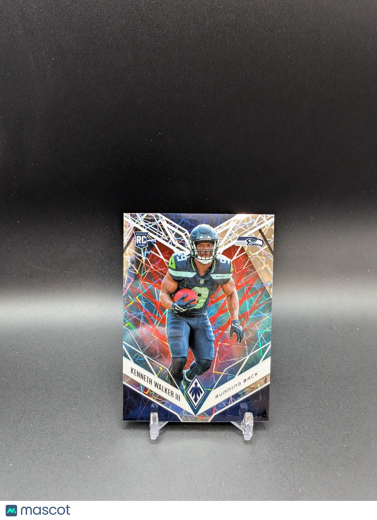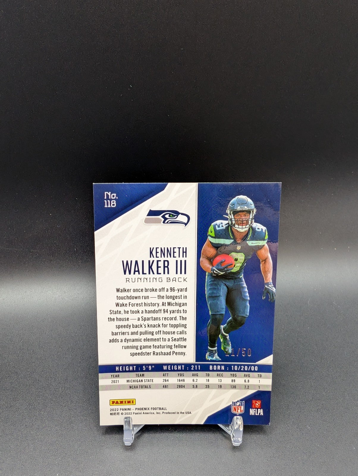 This sports trading card features Kenneth Walker III, a promising football player from the 2022 season. The card is a rare Fire and Ice parallel/variety, with a limited edition of only 50 copies. It is a valuable addition to any sports trading card collection. The card is in excellent condition and will be shipped with care to ensure its safe arrival. Listed With Mascot.