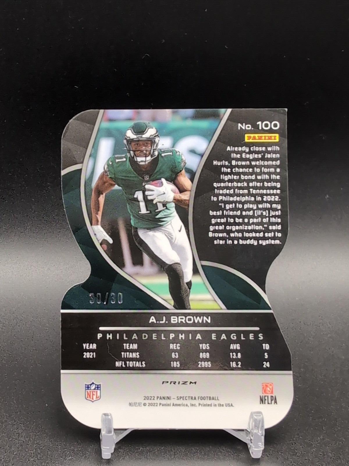 The product is a 2022 Panini Spectra trading card featuring A.J. Brown of the Philadelphia Eagles. This specific card is a Neon Green Die-Cut Prizm parallel with a limited print run of only 30 copies. It is a highly sought-after collectible for fans of the National Football League and football trading card enthusiasts alike. With its unique design, serial numbering, and rarity, this card would make a valuable addition to any sports card collection. Listed With Mascot.