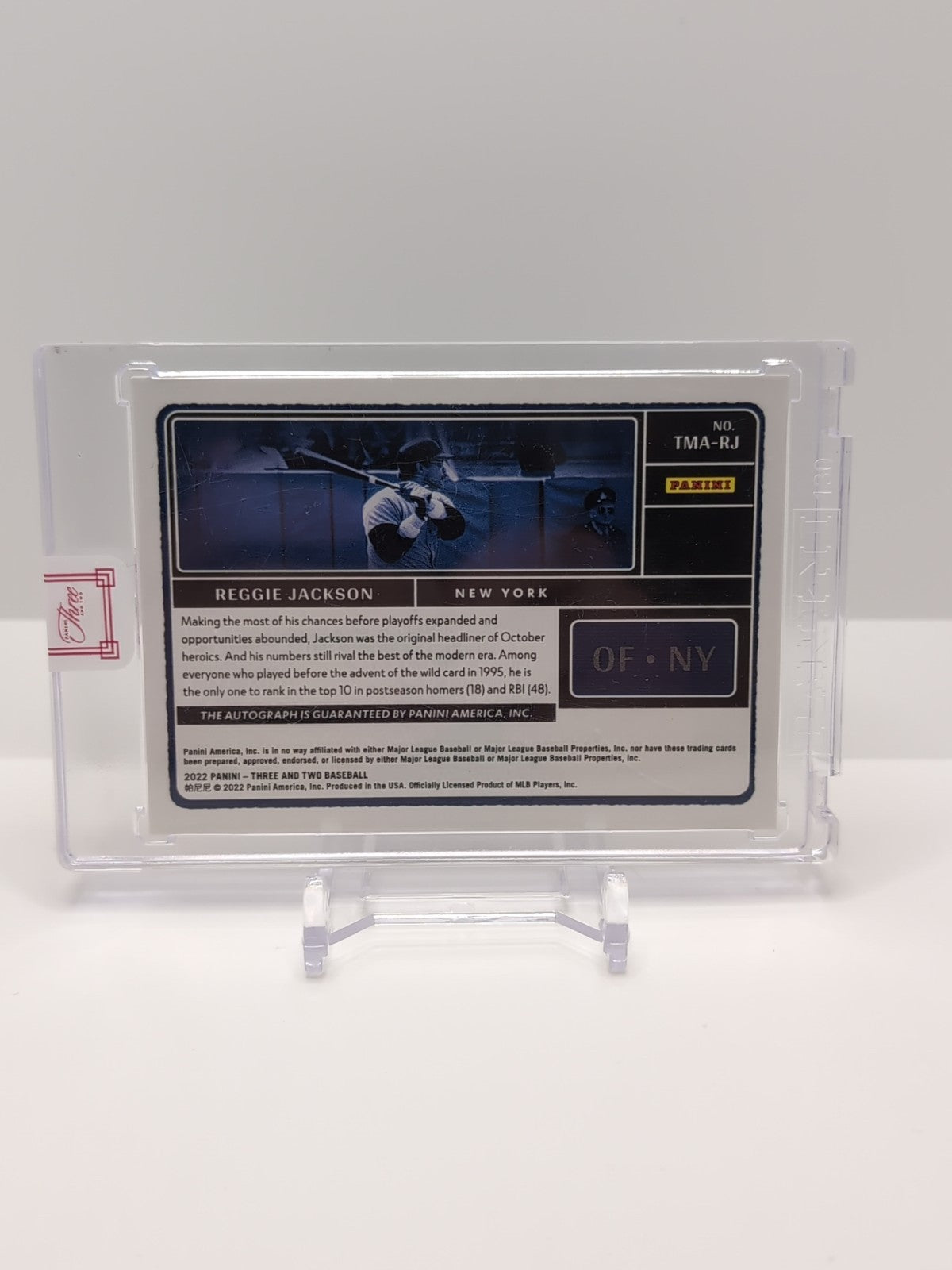 The 2022 Three and Two Baseball Timeless Moments Reggie Jackson AUTO Red /6 Yankees trading card is a limited edition sports collectible autographed by baseball legend Reggie Jackson himself. Manufactured by Panini America, Inc., this single-insert card features a red parallel variety and is part of the 2022 Panini Three and Two set. With only 6 cards in existence, this unique memorabilia item is a must-have for fans of Reggie Jackson and the New York Yankees, with the autograph authenticated by Panini Authentic for added value and authenticity. Listed With Mascot.