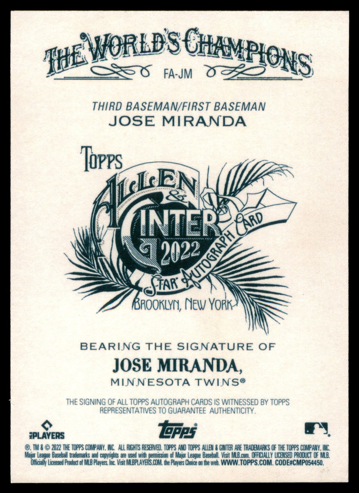 2022 Topps Allen & Ginter Jose Miranda #FA-JM Full-Size Autographs