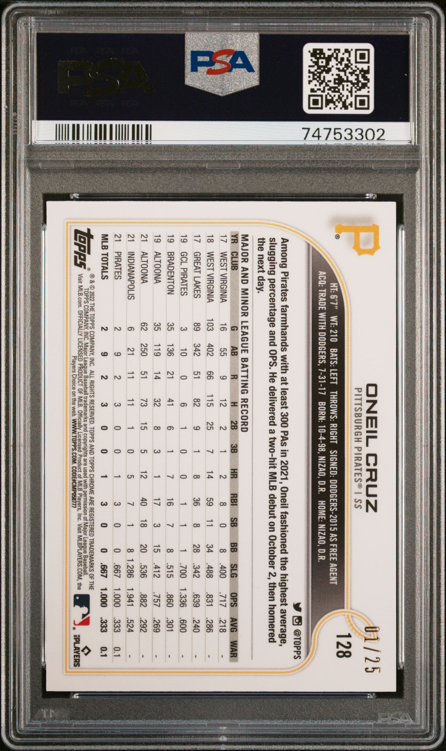 You are purchasing a 2022 Topps Chrome Ben Baller Oneil Cruz #128 Orange Refractor PSA 9. You will receive the exact item in the photographs. Thank you for looking. Listed With Mascot.