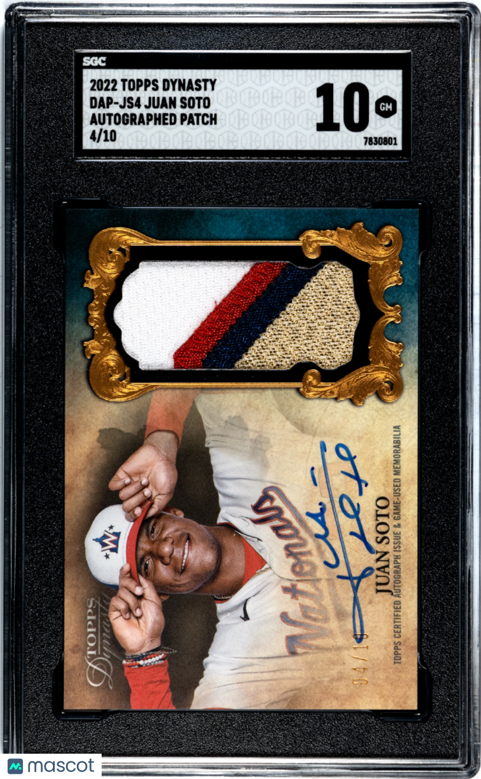 You are purchasing a 2022 Topps Dynasty Juan Soto #DAP-JS4 Autograph Patch SGC 10. You will receive the exact item in the photographs. Thank you for looking. Listed With Mascot.