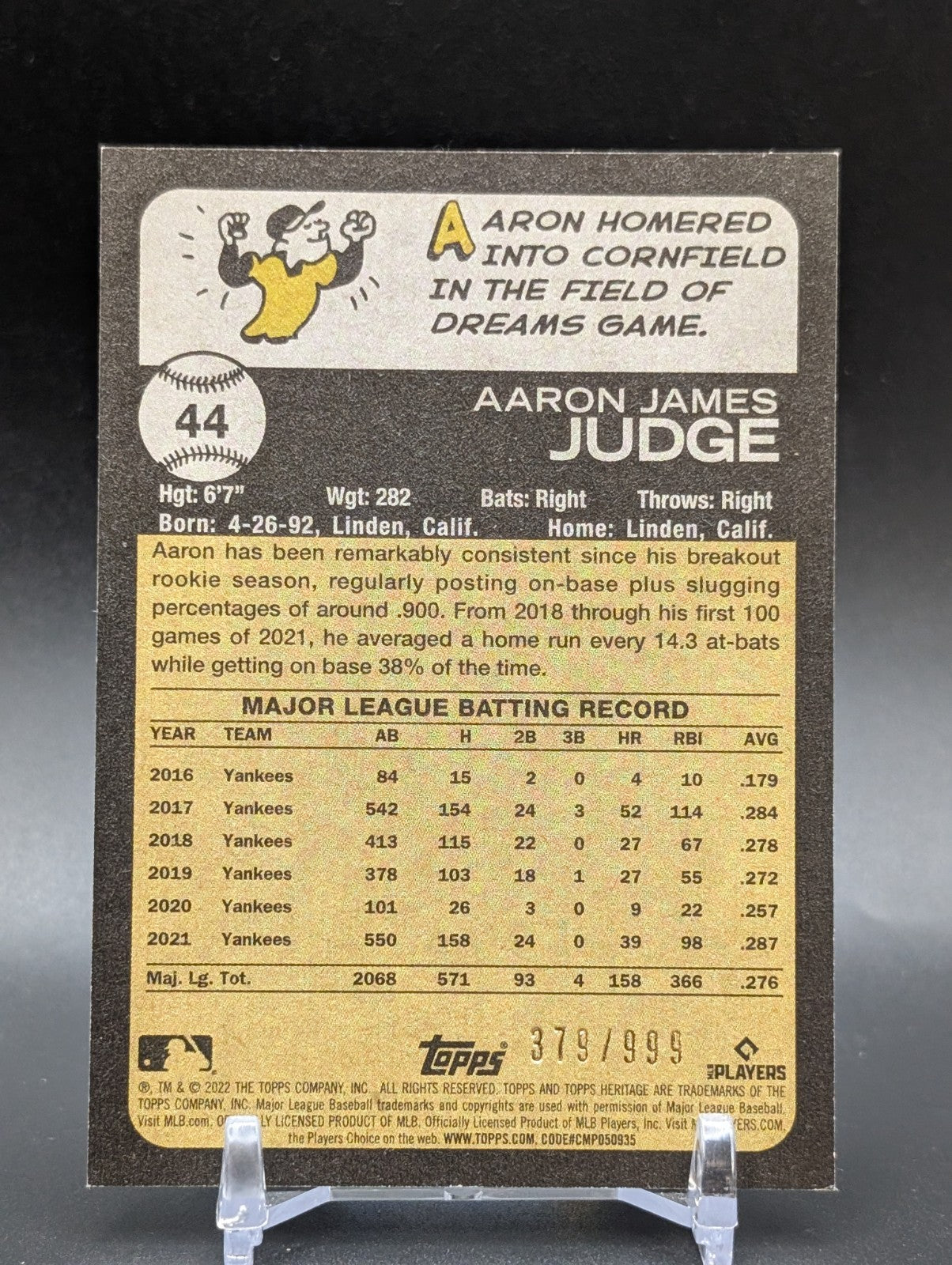 The product is a 2022 Topps Heritage Aaron Judge #44 Chrome /999 trading card featuring the New York Yankees player in Major League Baseball. This sports trading card is part of the base set and includes features such as being serial numbered and a parallel/variety. Manufactured by Topps, this limited print run card is a highly collectible item for baseball fans and card collectors alike. Listed With Mascot.