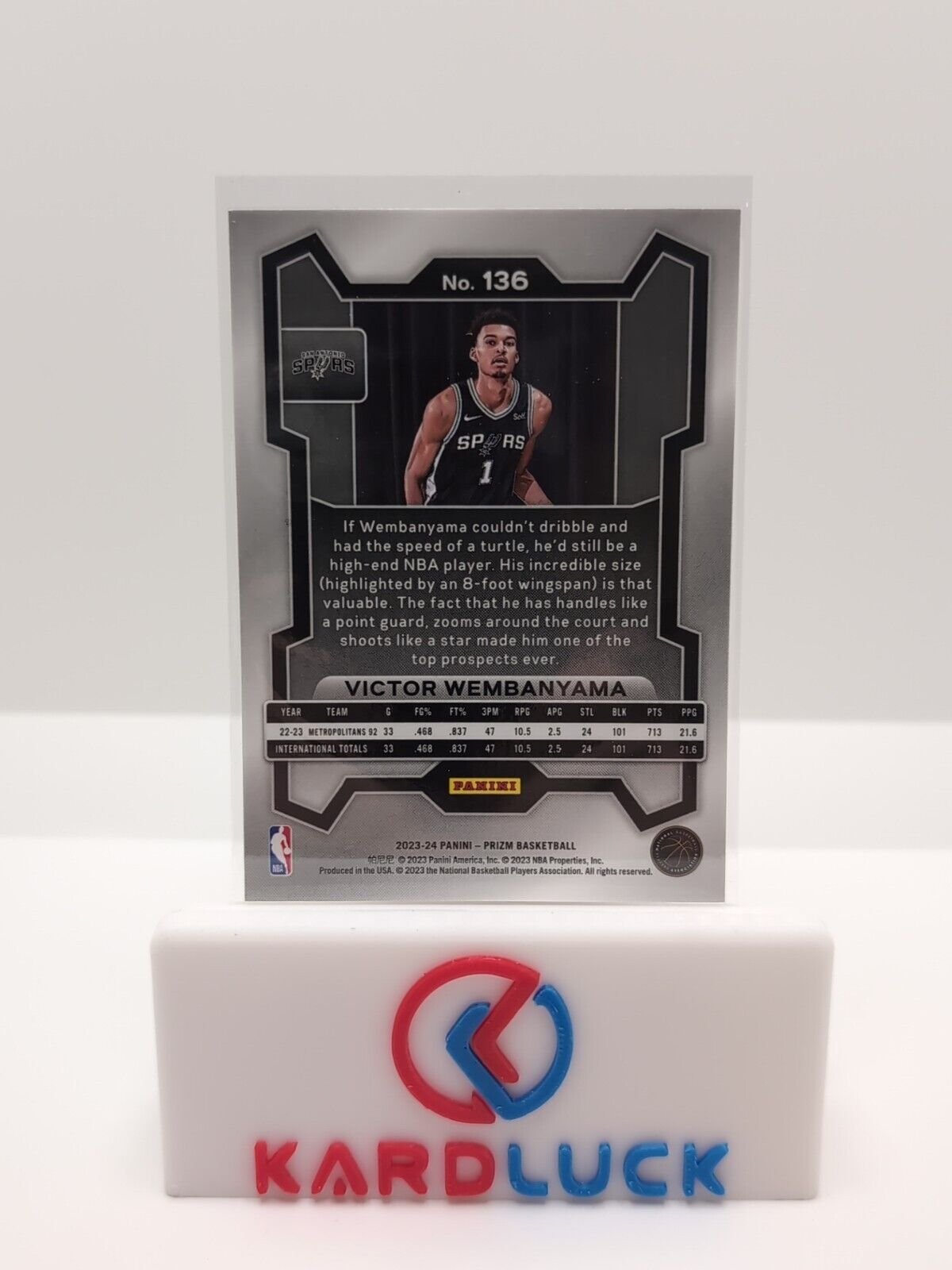 This 2023-24 Panini Prizm trading card features Victor Wembanyama, a promising rookie athlete from the San Antonio Spurs team. The card is an original base set card, numbered 136, and is part of the National Basketball Association (NBA) league. It is a standard size card and comes from the licensed manufacturer Panini. The card is a Prizm parallel variety and is perfect for sports trading card collectors who enjoy basketball. The card is not autographed and is written in English. Get your hands on this impressive card and add it to your collection today! Listed With Mascot.
