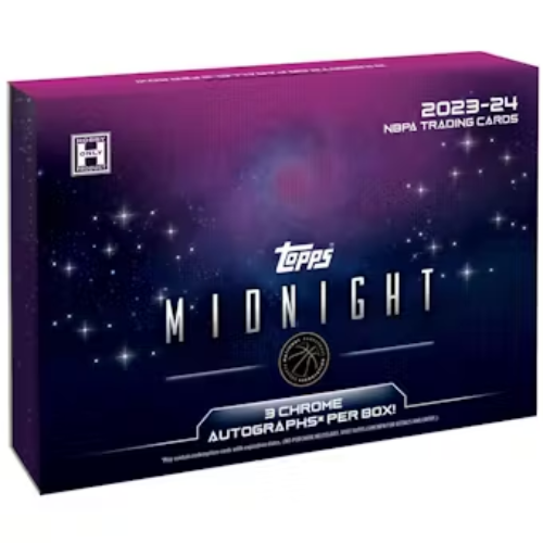 Step into the world of late-night hoops with the 2023/24 Topps Midnight Basketball Hobby Box! Featuring an all-new set for 2024, this box is packed with exclusive content, including three autographs per box, collectible rookie jersey autographs, and an array of stunning inserts and parallels.