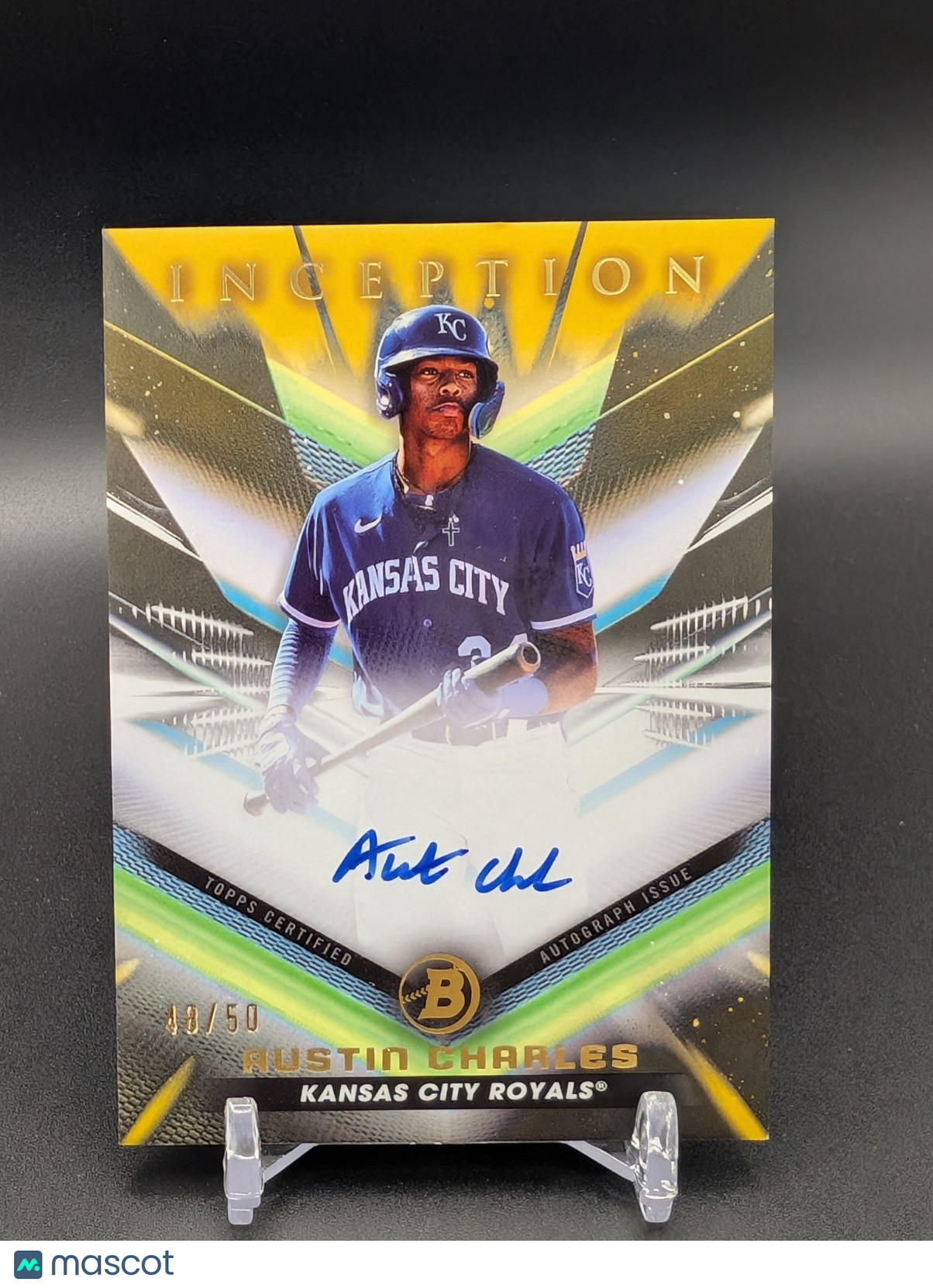 Elevate your baseball card collection with the 2023 Bowman Inception Austin Charles #92, a treasured rookie card featuring the Kansas City Royals' promising talent. Embrace the excitement of the season with this exclusive card, one of only 50 in existence with its striking gold parallel design. This card not only showcases Austin Charles in his professional beginnings but is also graced with his autograph, adding a personal touch from the athlete himself. Collectors and fans alike will appreciate the card's originality, as it comes directly from the reputable Bowman manufacturer, ensuring its authenticity and value for years to come. Listed With Mascot.