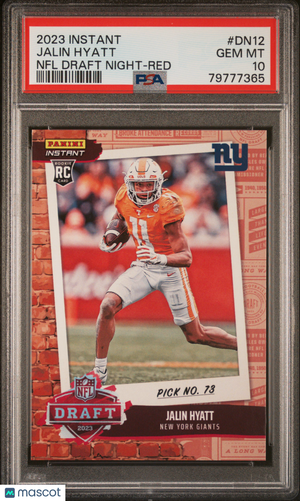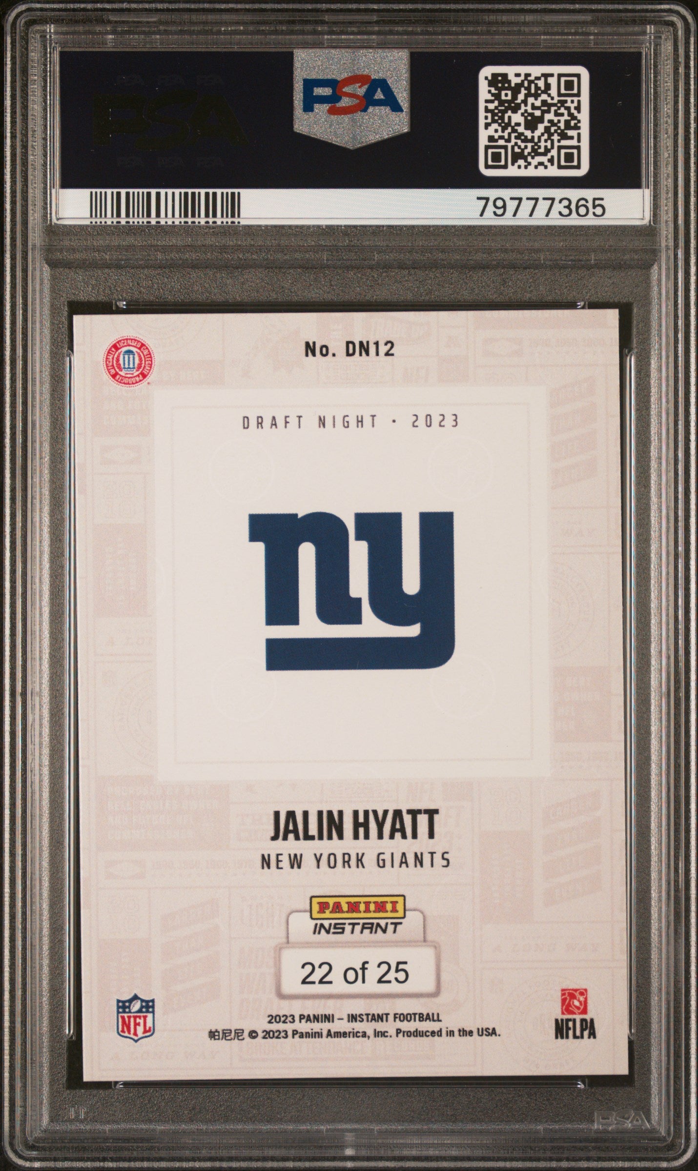 You are purchasing a 2023 Panini Instant NFL Draft Night Jalin Hyatt #DN12 Red PSA 10. You will receive the exact item in the photographs. Thank you for looking. Listed With Mascot.