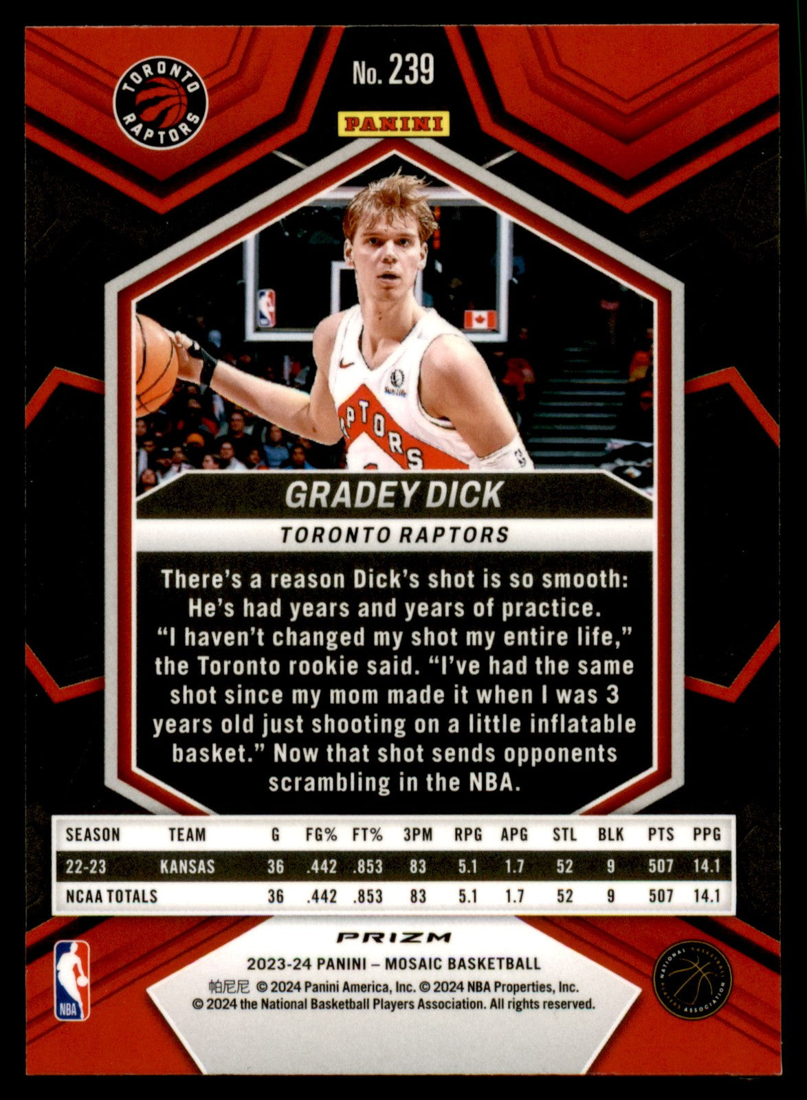 Item Description 2023 Panini Mosaic Gradey Dick #239 Green Mosaic Toronto Raptors Any visible lines on the images are due to the hi-res scanner and are not on the actual card. Refer to hi-res images to evaluate card condition Shipping Please refer to the listing specifics for shipping price. Return Policy No Returns for Trading Cards Consignment Options Looking to sell your cards, but don't have time? Reach out to use here on eBay and we will be happy to assist you! Listed With Mascot.