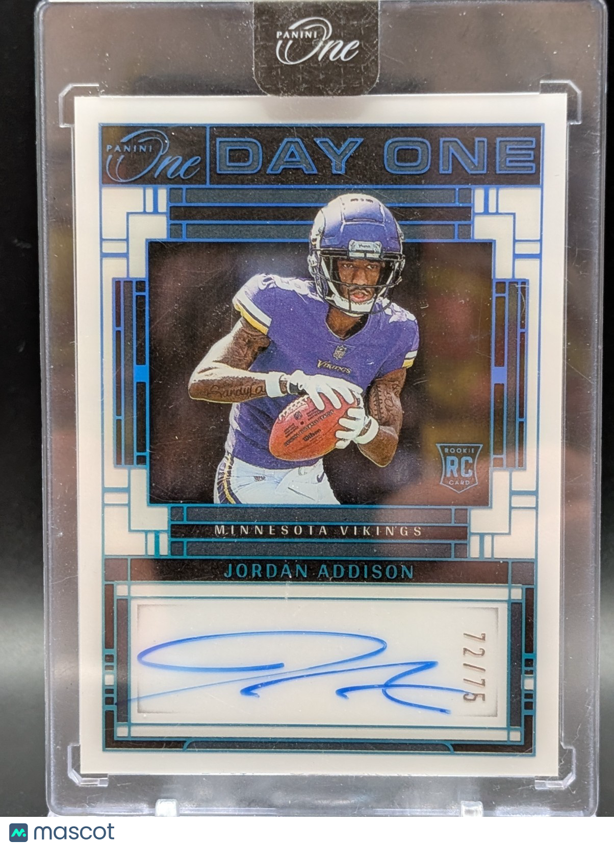 The 2023 Panini One Rookie Auto Blue /75 Jordan Addison trading card is a highly sought-after collectible featuring an authentic hard-signed autograph from the Minnesota Vikings rookie player. This limited edition card, part of the Panini Authentic autograph authentication, is a must-have for any NFL fans and trading card enthusiasts. With only 75 cards in existence, this rare piece is sure to be a valuable addition to any football card collection. Listed With Mascot.