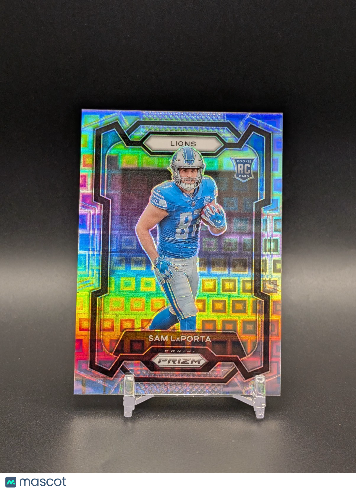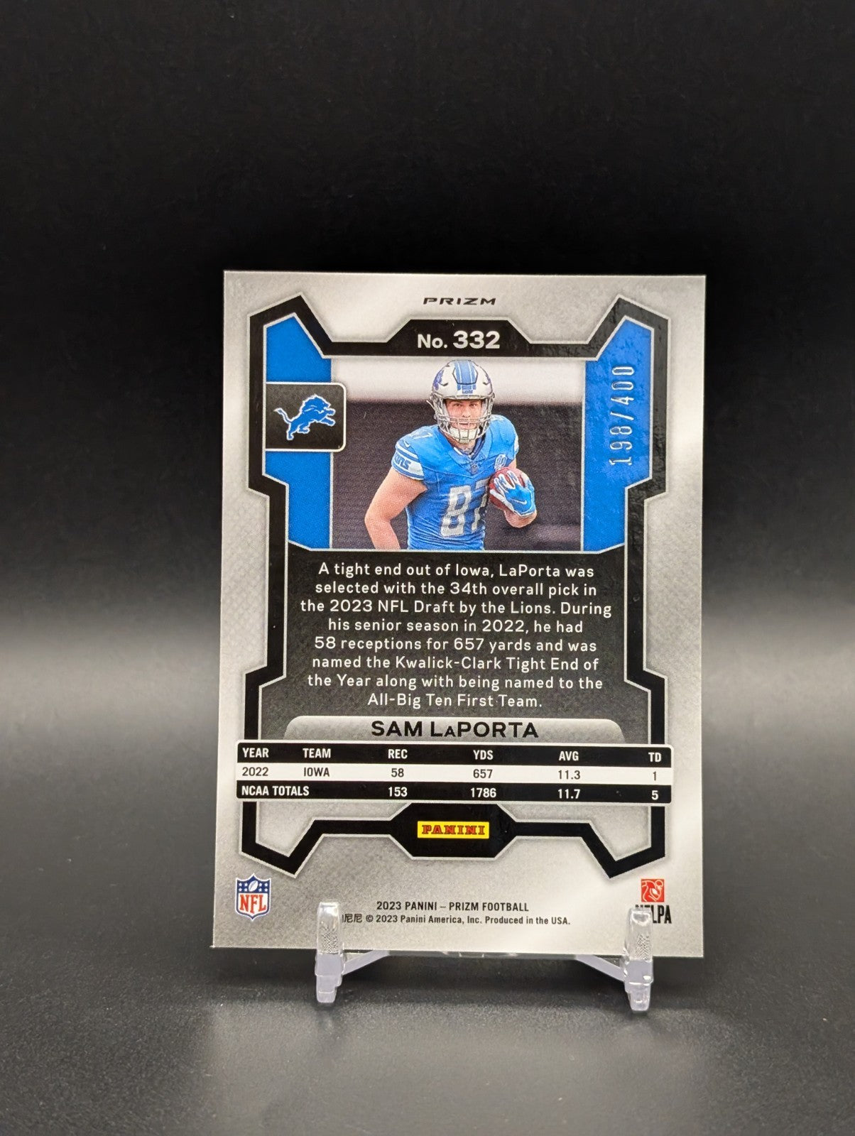 The 2023 Panini Prizm #332 Sam LaPorta Pandora 376/400 trading card features the rookie player from the Detroit Lions in the NFL. This base Pandora Prizm card is part of the Prizm set by Panini, making it a sought-after collectible for football fans and card enthusiasts. With its limited edition numbering and unique design, this card offers a special addition to any sports trading card collection, especially for fans of the Detroit Lions and Sam LaPorta. Listed With Mascot.
