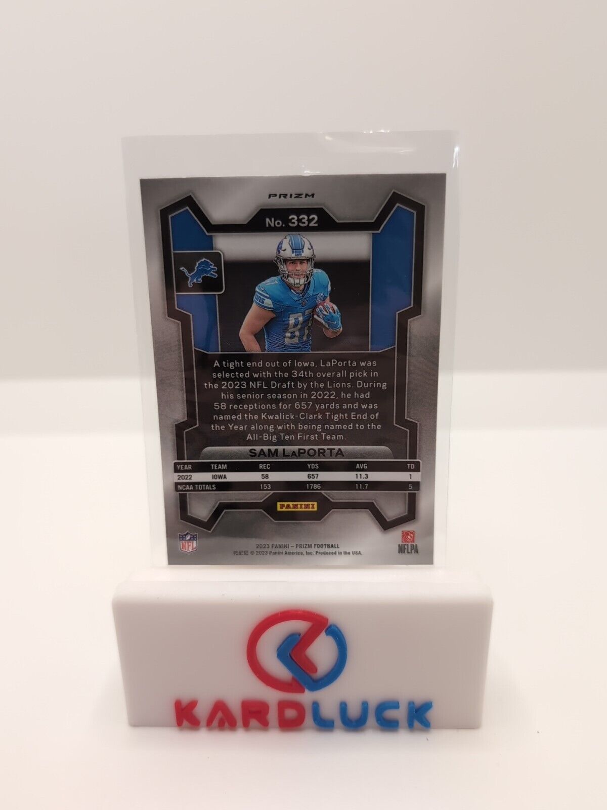This 2023 Panini Prizm sports trading card features Sam LaPorta, a rookie player from the National Football League (NFL) team, Detroit Lions. The card number is 332 and it is a short print with a cracked ice parallel/variety. It is a great addition to any football fan's collection and is from the 2023 season. This card is not autographed and is in excellent shape. Get your hands on this rare card before it's gone! Listed With Mascot.