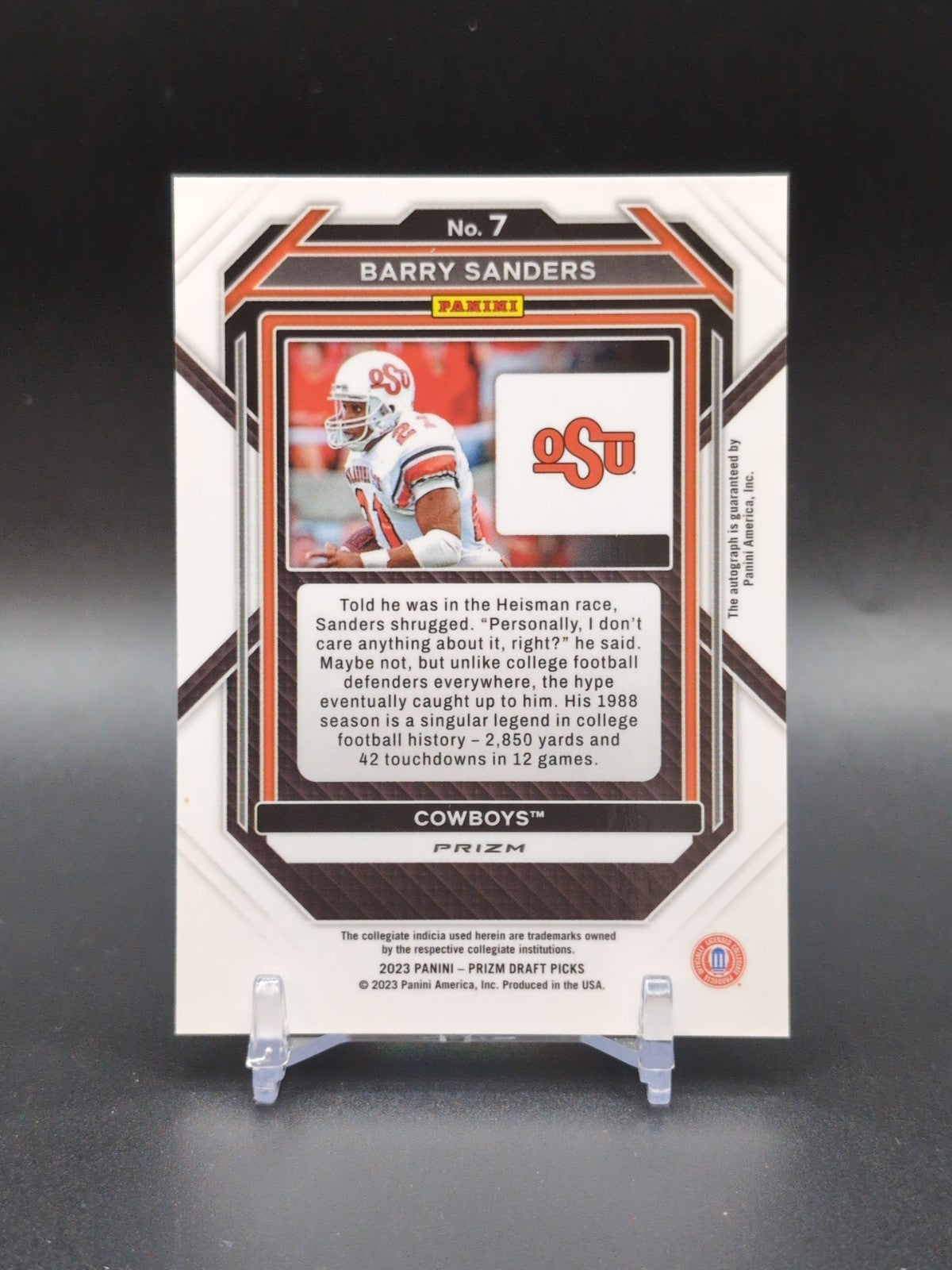 The product is a 2023 Prizm Draft Picks trading card featuring a Silver Prizm autograph of football player Barry Sanders from his time playing at Ohio State University (OSU). This card would be a highly sought-after collectible for fans of football, trading cards, and Sanders himself, showcasing his signature and a shiny silver design that adds to its appeal and value. With the current market for sports trading cards being so strong, the prospect of owning such a limited and special piece would be a desirable one for collectors and fans alike. Listed With Mascot.