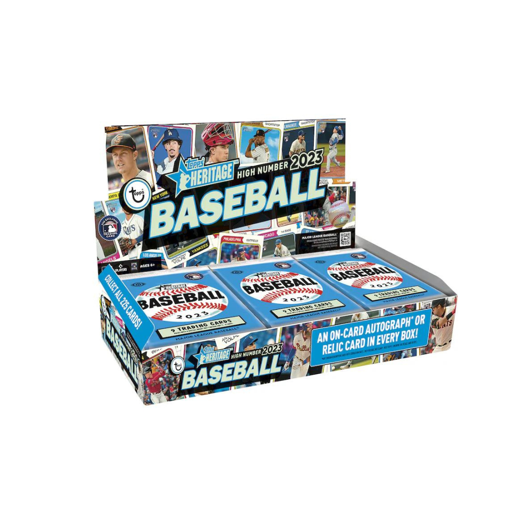 The 2023 Topps Heritage High Number Baseball Hobby Box is a set of baseball cards that contains 200 cards (#501-700) featuring traded players and late rookie call-ups. The last 25 cards in the base set (#701-725) are short prints. The box also contains Real One Autographs, Clubhouse Collection Relics, and all new inserts, and additional cards celebrating the 1974 and 2023 seasons.