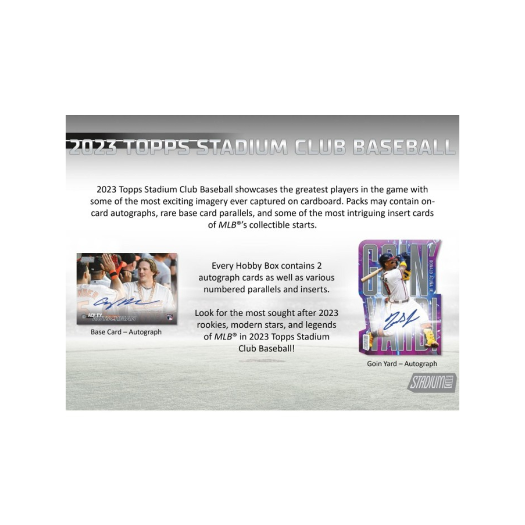 Each Pack contains seven (7) 2023 Topps Stadium Club Baseball Base Cards + One (1) Insert or Parallel card. Each box contains one (1) Autograph Card and one (1) Chrome Parallel Card OR one (1) Triumvirates Insert Card.