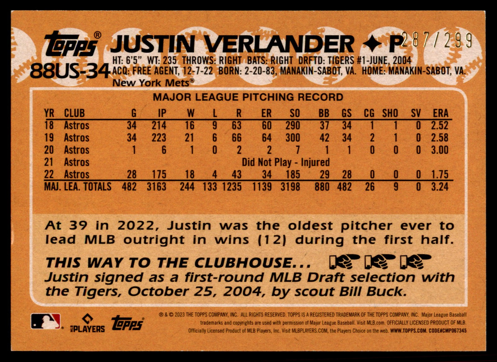 2023 Topps Update Justin Verlander #88US-34 1988 Topps Baseball Black /299