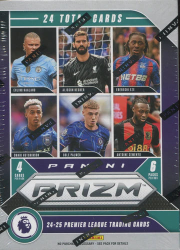 Get ready for the return of Panini Prizm, one of the most sought-after products in the hobby, celebrating the 2024-25 Premier League season. Each blaster box delivers 6 packs with 4 cards per pack, showcasing stunning Opti-Chrome technology that highlights the biggest league in the world.