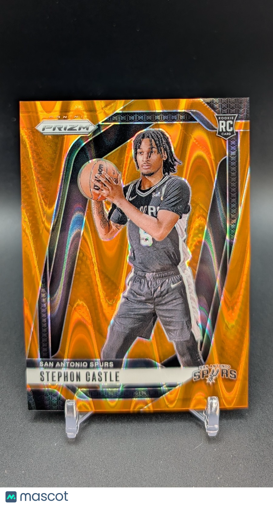 Elevate your basketball card collection with the 2024-25 Panini Prizm - Stephon Castle #234 Orange Seismic Prizm /199 (RC). This card showcases the promising talent of Stephon Castle, capturing the essence of his rookie season with the San Antonio Spurs. The vibrant Orange Seismic Prizm parallel adds an exciting layer of collectibility, highlighting Castle's potential as an NBA star. This limited edition card, numbered to just 199, is a must-have for fans and collectors alike. Meticulously crafted in the United States, the card is a true piece of sports memorabilia that celebrates the NBA Finals and the craftsmanship of Panini. Add this exceptional card to your set today and own a piece of basketball history. Listed With Mascot.