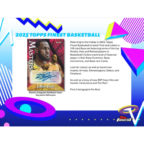 Topps Finest Basketball makes its bold return in 2025 with the exclusive Breaker Delight Box—built for serious collectors and high-energy group breaks. Packed with premium content and designed for the spotlight, each box delivers an average of three autographs, five Base Geometric cards, and two Insert Geometric cards, providing nonstop action from the first rip to the last.