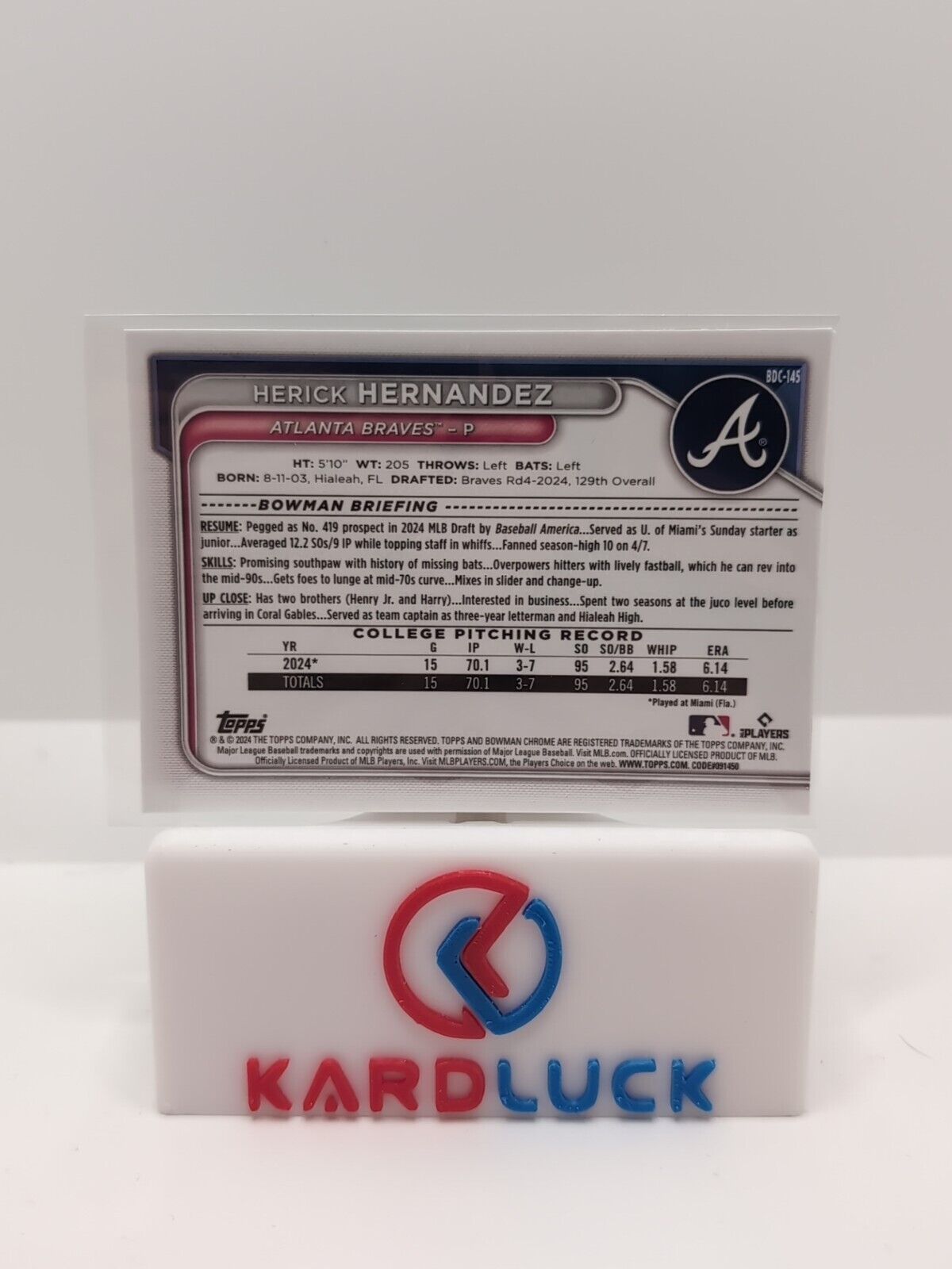 This is a 2024 Bowman Chrome trading card featuring Herick Hernandez, a rookie player for the Atlanta Braves in Major League Baseball. The card is a Sky Blue Refractor parallel variety, specifically numbered as BDC-145 in the 2024 Bowman set. It is a sports trading card manufactured by Bowman, showcasing Hernandez as a prospect for the 2024 season. This collectible item appeals to fans and collectors interested in baseball trading cards, especially those focusing on rookie players and parallel varieties. Listed With Mascot.