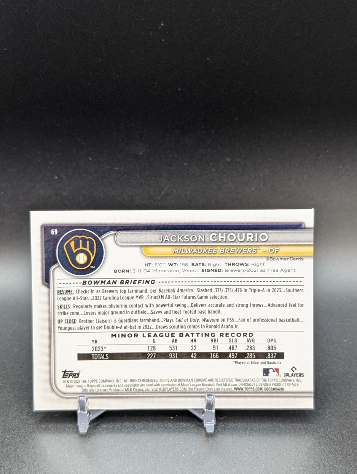 Elevate your baseball card collection with the 2024 Bowman Chrome Mega Blue Mojo Refractor featuring the talented Jackson Chourio of the Milwaukee Brewers. This limited-edition card, numbered 69, showcases the rising star in stunning detail, a must-have for fans and collectors alike. The card, part of the esteemed 2024 Bowman Chrome set, captures Chourio's potential and is a sought-after piece for its Blue Mojo Refractor parallel variety. A notable addition to any MLB memorabilia, this card is a tangible piece of baseball history that celebrates the next generation of talent. Listed With Mascot.
