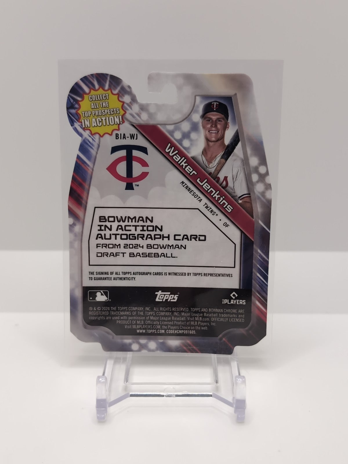 The product is a 2024 Bowman Chrome trading card featuring baseball player Walker Jenkins in his Bowman In Action Auto variation. This limited edition card has a print run of only 75 copies, making it a highly sought-after collectible among fans and collectors. Manufactured by Bowman, the card showcases Jenkins in action and is part of the 2024 Bowman set, making it a valuable addition to any sports trading card collection. Listed With Mascot.