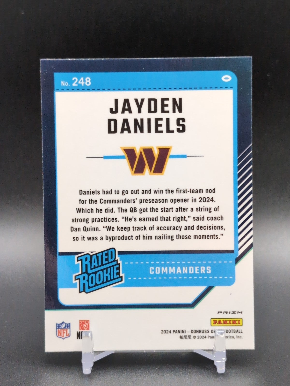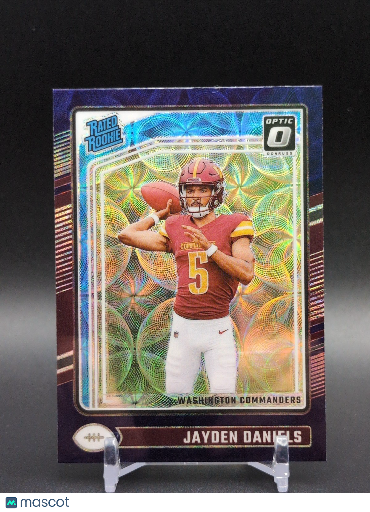 The product is a 2024 Donruss Optic Purple Scope #248 Jayden Daniels RC Rated Rookie trading card. This card features Jayden Daniels, a football player, and is part of the 2024 Donruss Optic set by the manufacturer Donruss. As a rookie card, it holds significance for collectors and fans looking to obtain cards from up-and-coming players like Daniels. This particular card is the Purple Scope parallel, adding a unique design element to the overall collection. Listed With Mascot.