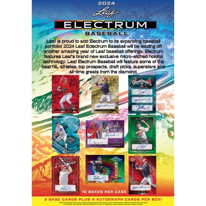 Leaf is proud to add Electrum to its expanding baseball portfolio! 2024 Leaf Electrum Baseball will be leading off another amazing year of Leaf baseball offerings. Electrum features Leaf's brand new exclusive micro-etched holofoil technology. Leaf Electrum Baseball will feature some of the best NIL athletes, top prospects, draft picks, superstars, and all-time greats from the diamond.