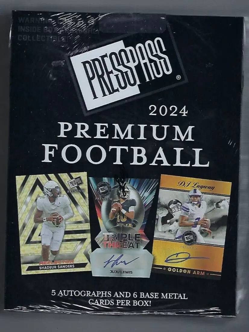 Leaf is proud to announce the return of a longtime Hobby favorite, Press Pass Football! 2024 Press Pass Premium will bring you the top football players from the past, present and future all on Metal technology. Look for the return of some fan favorite inserts and even more rare die-cut autograph cards. Every Box, on average, will contain 4 Base, 2 Base Parallels #'d to 35 or less, 4 Autograph or Retro Autograph cards #'d to 99 or less plus 1 Insert Autograph or Die-Cut Autograph #'d to 25 or less!