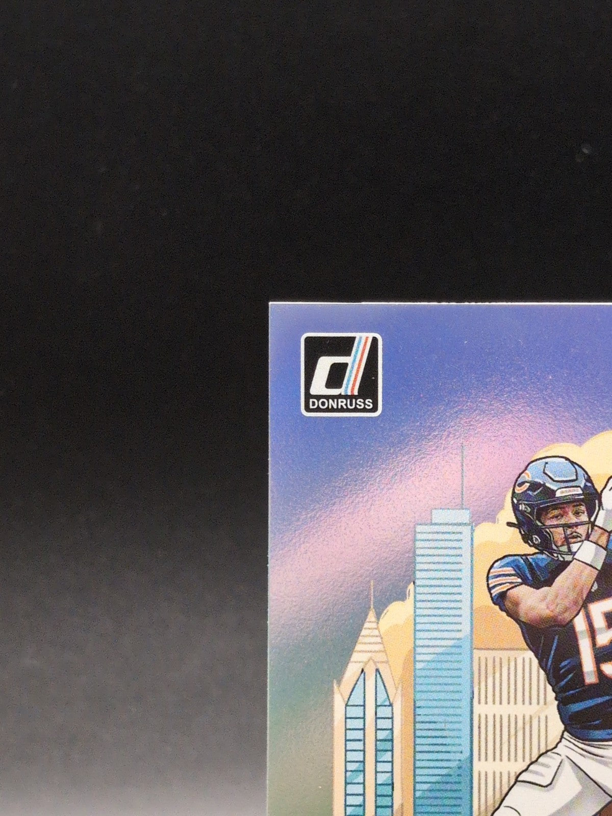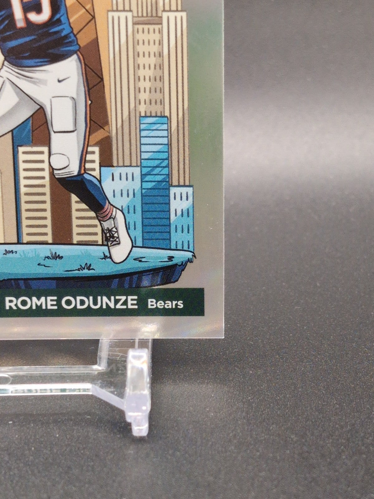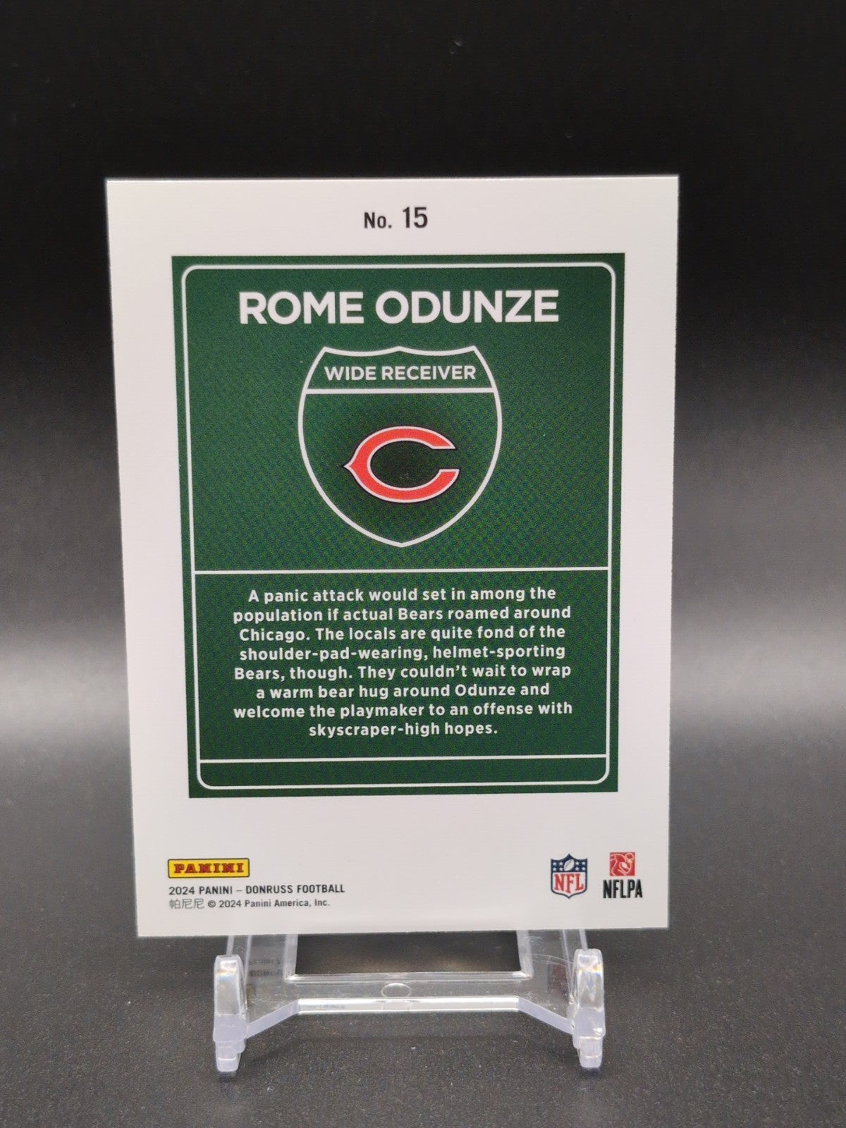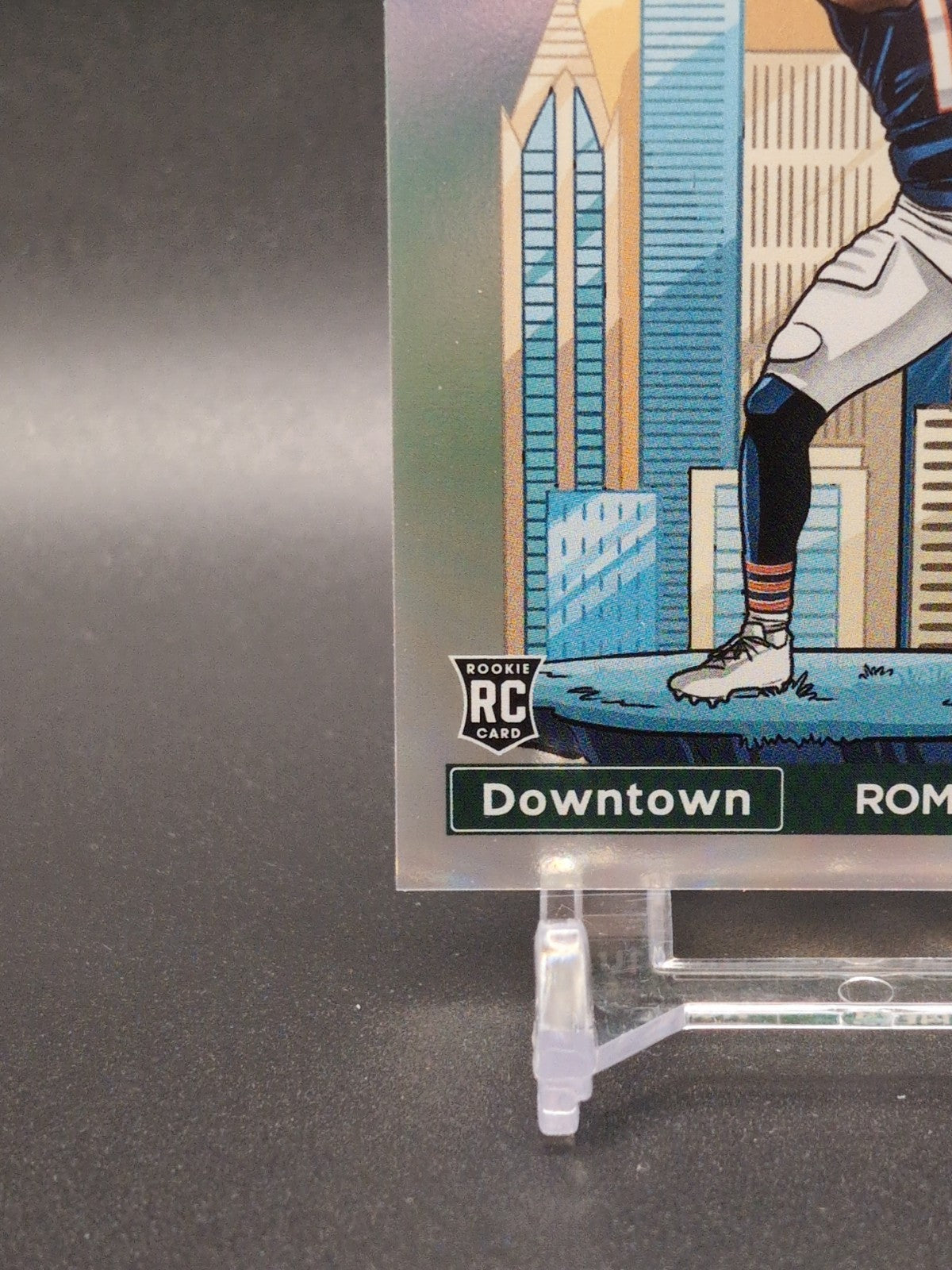 The 2024 Panini Donruss Downtown! trading card features rookie player Rome Odunze from the Chicago Bears. This card is part of the special Downtown! insert set and is made of card stock. It is a base parallel variety card with card number 15, manufactured by Panini in the United States. This collectible item is a must-have for fans of the National Football League looking to add a unique piece to their trading card singles collection. Listed With Mascot.