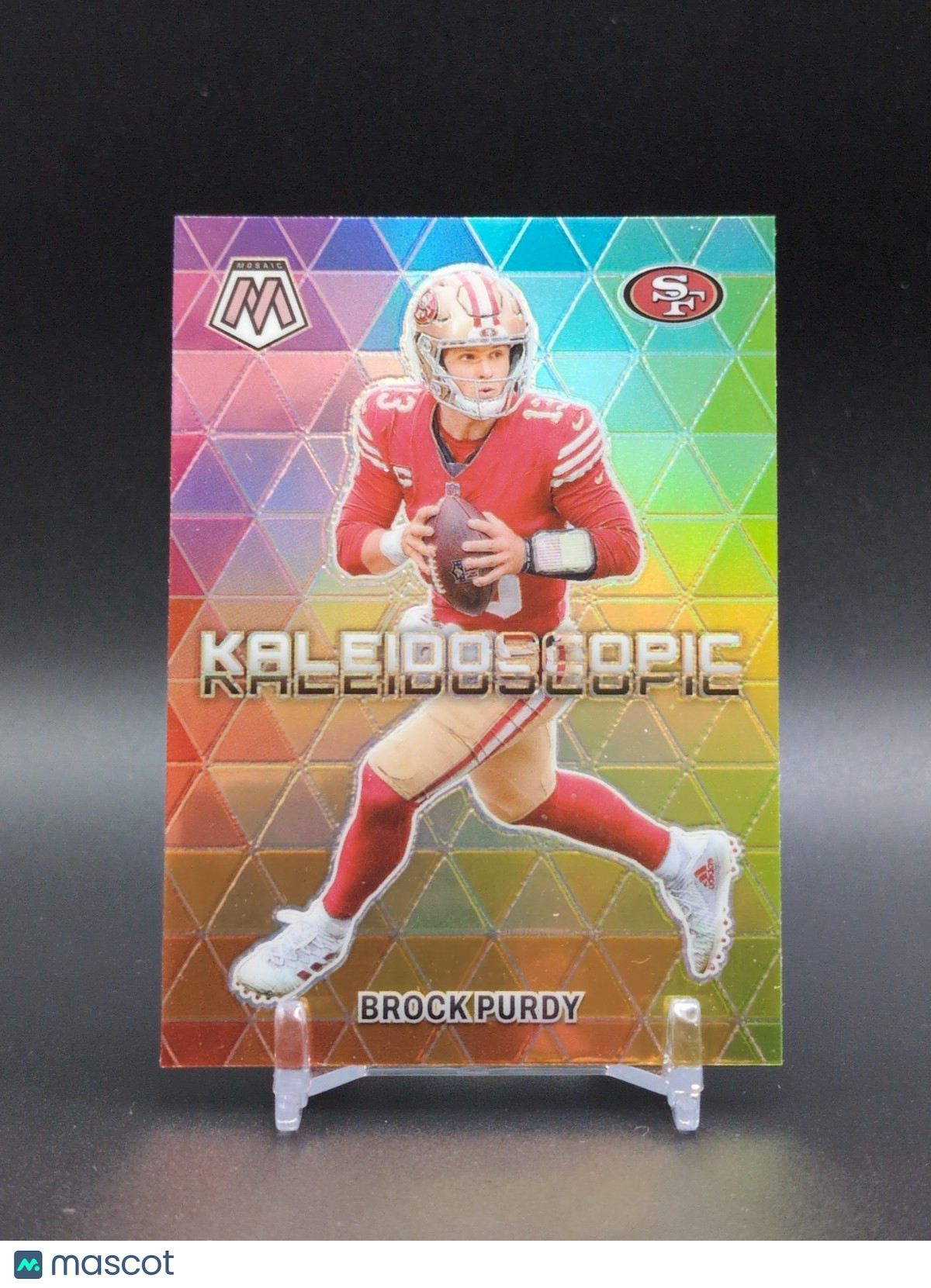 The 2024 Panini Mosaic Football Kaleidoscopic Brock Purdy SSP #8 Case Hit 49ers trading card is a highly sought-after collectible featuring the player Brock Purdy from the San Francisco 49ers. This exclusive card is part of the Kaleidoscopic insert set, known for its hologram technology and unique design. Manufactured by Panini in the United States, this original card is a parallel variety with a short print run, making it a valuable addition to any football card collection. The card is made of card stock and is licensed by the National Football League, making it a must-have for fans and collectors alike. Listed With Mascot.