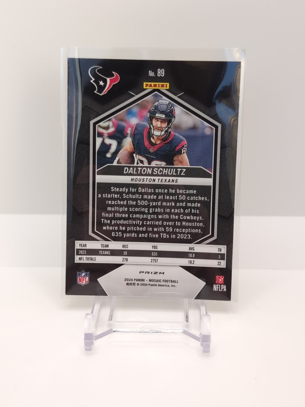 The product is a 2024 Panini Mosaic trading card featuring Dalton Schultz of the Houston Texans. This specific card is part of the Reactive Yellow Mosaic Prizm parallel/variety, adding a unique visual element to the base set. As a sports trading card, it is a collectible item sought after by fans and collectors of the National Football League (NFL). The card number is 89 and it showcases Schultz as a player in the upcoming 2024 season. Listed With Mascot.