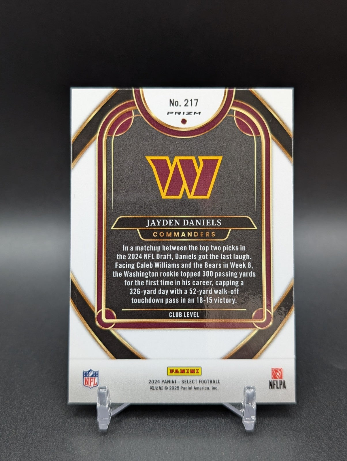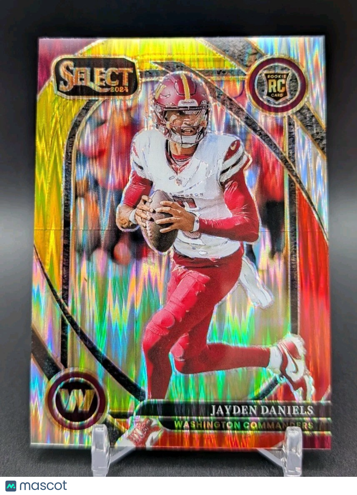 The 2024 Panini Select Club Level Jayden Daniels #217 Red & Yellow Shock Prizm (RC) trading card features the rookie player Jayden Daniels from the Washington Commanders in the National Football League (NFL). Manufactured by Panini, this original card is part of the 2024 Panini Select set and showcases a Red & Yellow Shock Prizm parallel variety. Made of card stock with a thickness of 20 Pt., this standard-sized sports trading card is a valuable addition to any football card collection. Listed With Mascot.