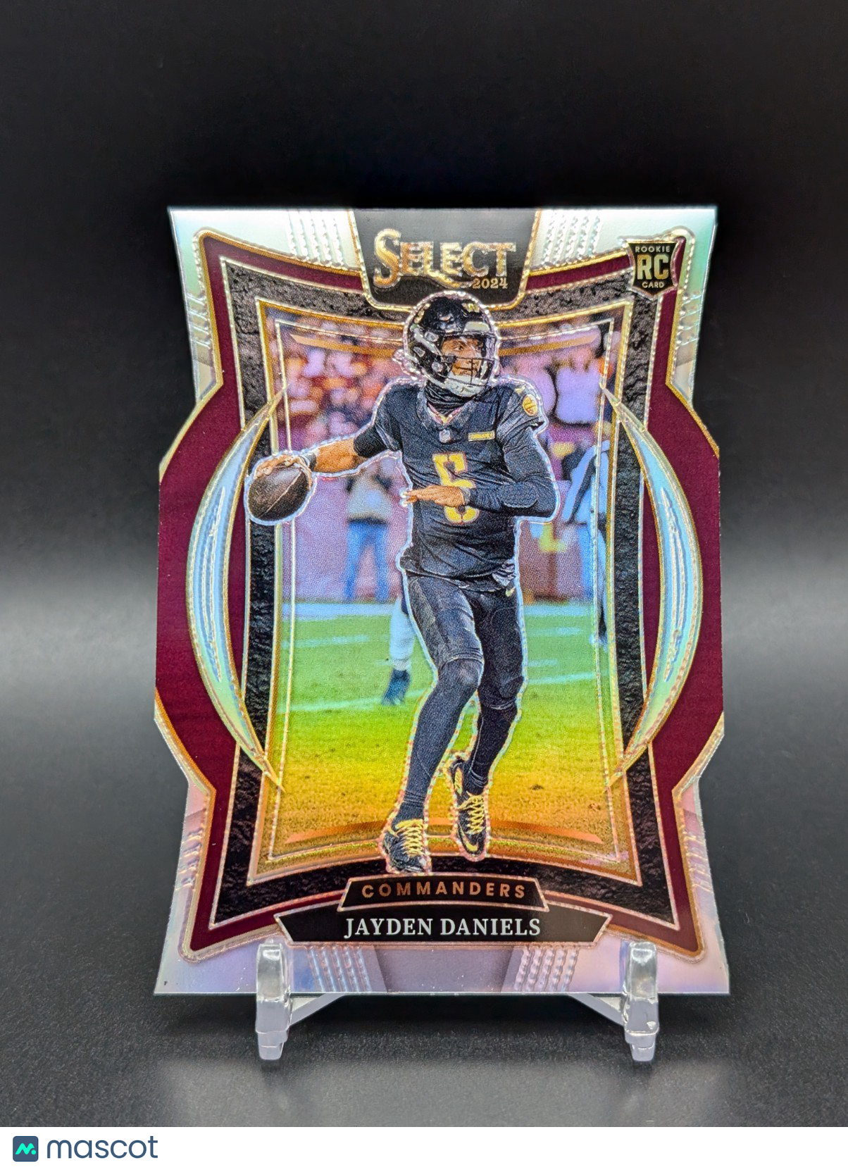The 2024 Panini Select Football Jayden Daniels Concourse RC Silver Prizm Die-Cut trading card is a highly sought-after collectible featuring a rookie player from the Washington Commanders. This original card is from the 2024 Panini Select set and is made of 20 Pt. card stock. With a unique silver prizm die-cut design, this card is sure to be a standout addition to any football card collection. It celebrates the promising talent of Jayden Daniels and is a must-have for fans of the National Football League. Listed With Mascot.