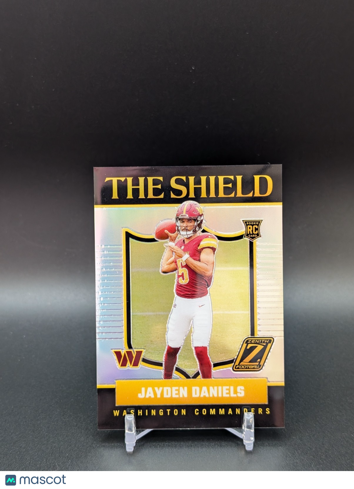 Elevate your football card collection with the 2024 Panini Zenith Jayden Daniels The Shield Prizm Case Hit #2. This exceptional rookie card showcases the potential of the Washington Commanders' standout quarterback. It features the coveted 'The Shield' insert set, and its 'Prizm' parallel variety adds a dazzling twist that catches the eye of every collector. As a standard-sized, original licensed print from the United States, this card is a non-autographed treasure from the National Football League's 2024 season. Its 35 Pt. card thickness ensures durability, while the English language and card stock material offer the classic feel of traditional trading cards. Secure this rare chase card and own a piece of Jayden Daniels' storied career. Listed With Mascot.