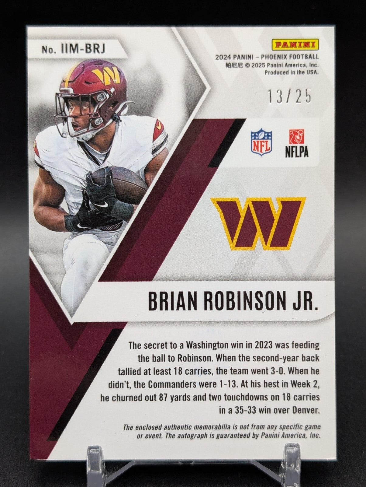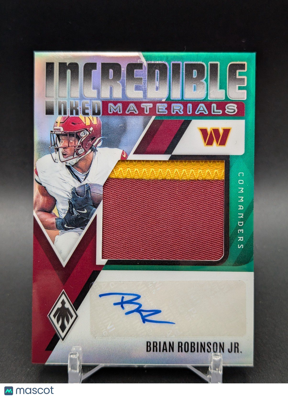 The 2024 Phoenix Brian Robinson Jr. Incredible Inked Materials Patch Auto /25 is an oversized trading card featuring an autograph from Brian Robinson Jr. of the Washington Commanders. This Panini Phoenix card is part of the 2024 set and includes a label or sticker autograph authentication from Panini Authentic. The card is a limited edition, with only 25 copies in existence, and is made of high-quality card stock. It is a valuable collectible for fans of football and trading card enthusiasts alike. Listed With Mascot.
