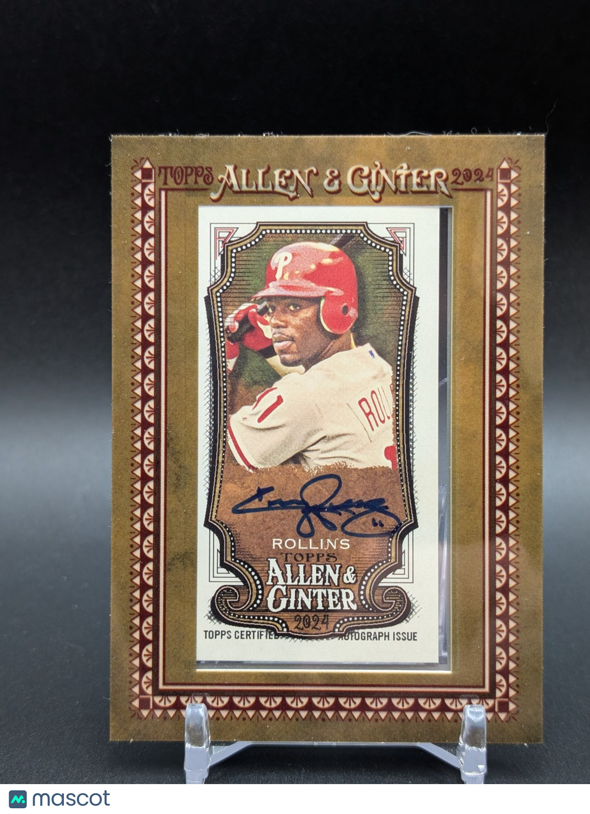 The product is a 2024 Topps Allen & Ginter Jimmy Rollins framed mini on-card autographed trading card. This card is a rare and collectible item featuring the player Jimmy Rollins, known for his skills in football. The card is manufactured by Topps and is part of the 2024 Topps set, making it a valuable addition to any sports trading card collection. Listed With Mascot.