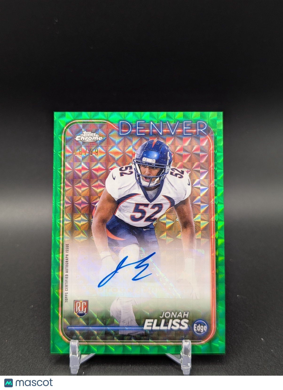 Capture a piece of football history with the 2024 Topps Chrome Jonah Elliss Rookie Green Geometric Refractor card, a must-have for fans and collectors alike. This striking card celebrates the promising talent of Jonah Elliss, the Baltimore Ravens' rising star, and is a unique addition to any collection. Limited to just 99 copies, this card boasts the distinct Green Refractor parallel, enhancing its visual appeal and collectibility. As an original release from Topps Chrome, it stands as a testament to Elliss's rookie season, making it a valuable and memorable piece for enthusiasts of the sport. Listed With Mascot.