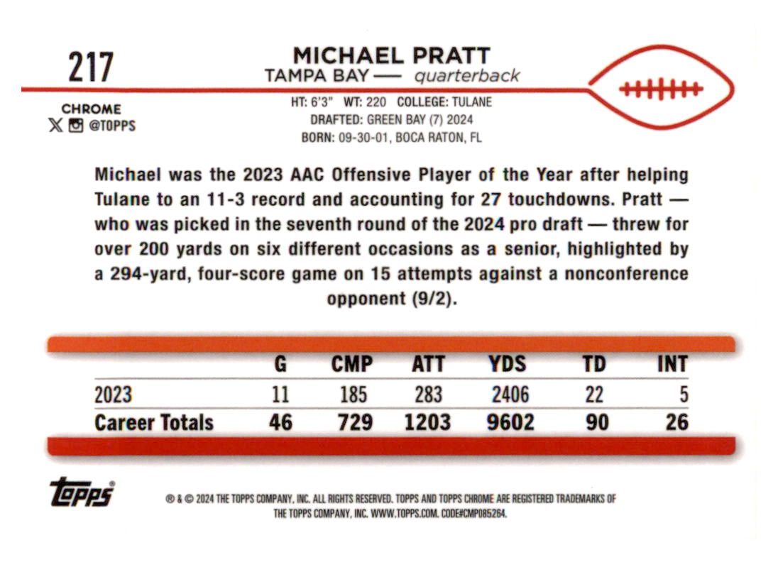 You are purchasing a 2024 Topps Chrome Michael Pratt #217 Gold Wave Refractor RC. You will receive the exact item in the photographs. Thank you for looking. Listed With Mascot.