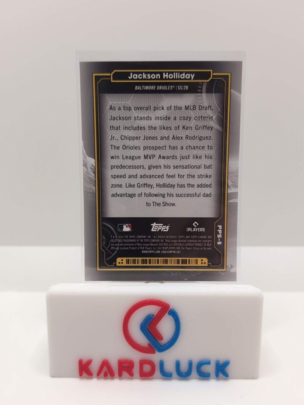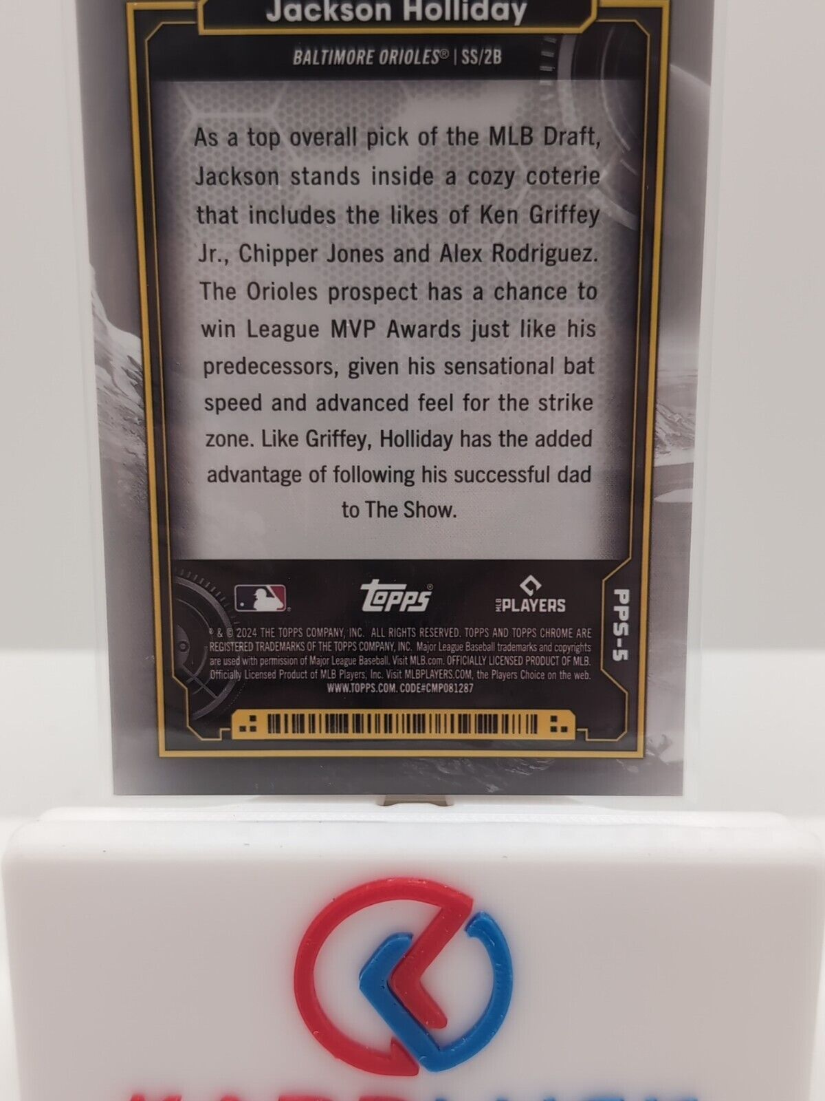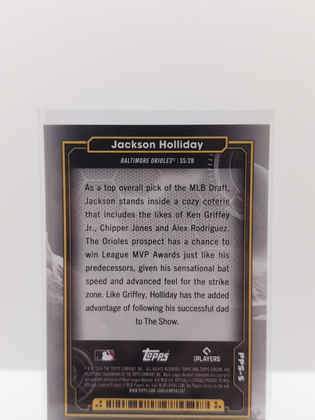 This is a 2024 Topps Cosmic Chrome sports trading card featuring Jackson Holliday of the Baltimore Orioles. The card is a rookie card and is part of the Planetary Pursuit set. It has a card number of PPS-5 and is a refractor parallel/variety. The card is not autographed and is a great addition to any Major League (MLB) baseball fan's collection. The card is manufactured by Topps and is a must-have for any sports trading card collector. Listed With Mascot.