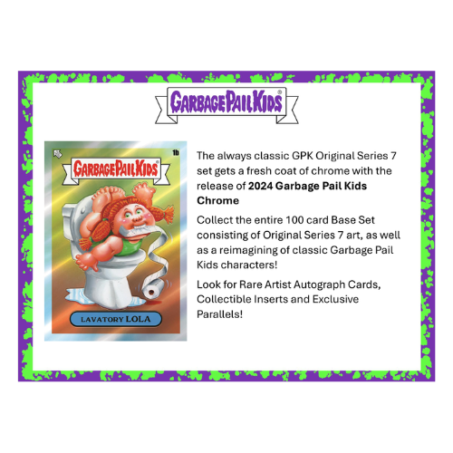 Experience the nostalgia of Garbage Pail Kids like never before with 2024 Garbage Pail Kids Chrome! This release brings a fresh, high-quality chrome finish to the classic Original Series 7, delivering 100 iconic characters, rare refractors, artist autographs, and brand-new inserts.