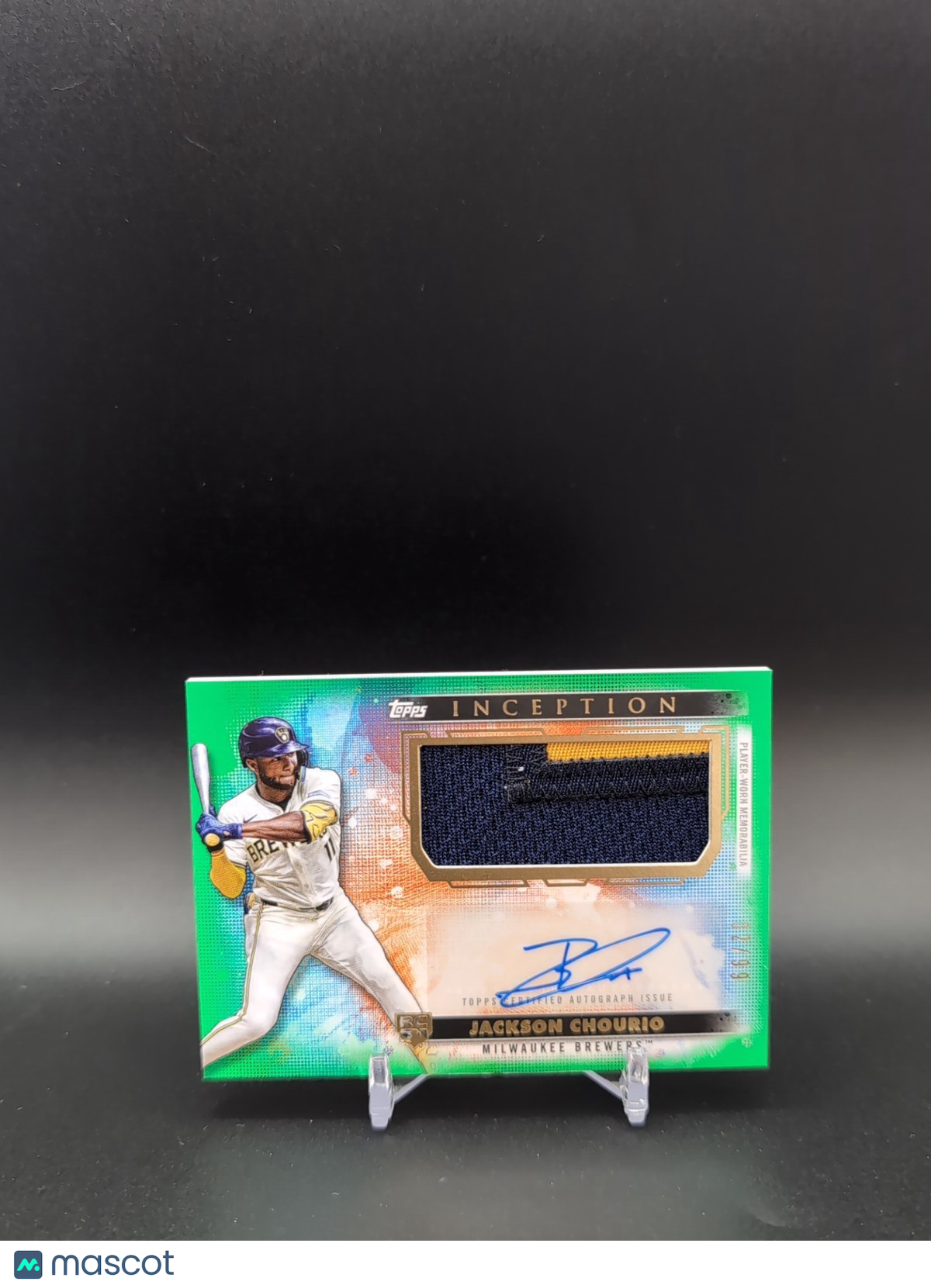The product is a 2024 Topps Inception Jackson Chourio Rookie Patch Auto Green card, featuring an autograph from Jackson Chourio of the Milwaukee Brewers. This sports trading card is made of card stock and is an original release by Topps. It is a rare parallel variety with a serial number out of 99, making it a valuable collector's item for fans of Major League Baseball. The card is in English and includes a patch from Chourio's jersey. Listed With Mascot.
