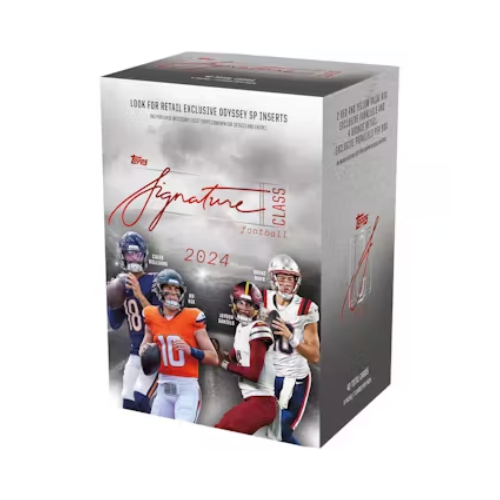 Get closer to the game’s brightest stars with the all-new 2024 Topps Signature Class Football 6-Pack Blaster Box. Each box is loaded with must-have content, featuring two Red & Yellow Parallels and four Bronze Retail Exclusive Parallels on average.