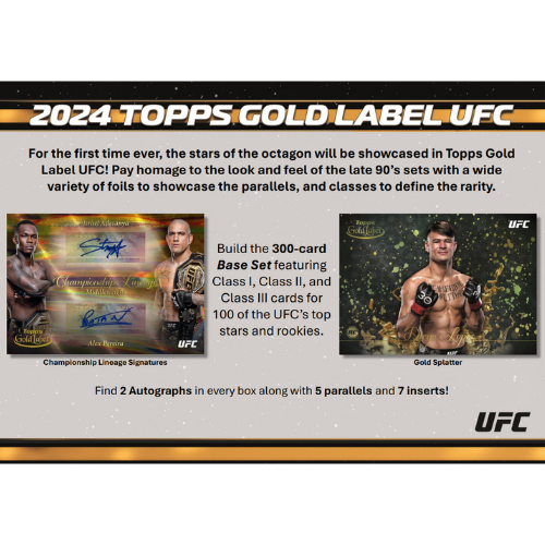 Step into the octagon with Topps Gold Label UFC, the ultimate trading card experience for fight fans and collectors. Celebrating the iconic design and foil finishes of the late 90s, this set combines nostalgia with modern UFC action. Featuring a stunning 300-card base set, you’ll find top UFC stars and promising rookies across Class I, Class II, and Class III rarity levels.