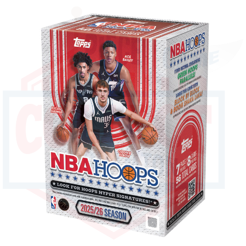Each box includes 7 packs with 8 cards per pack, giving you multiple chances to uncover standout rookies, established superstars, and exclusive retail content. Hoops continues its tradition of offering one of the most comprehensive base sets in the hobby, featuring a deep 300-card checklist that highlights the league’s biggest names and rising talent.