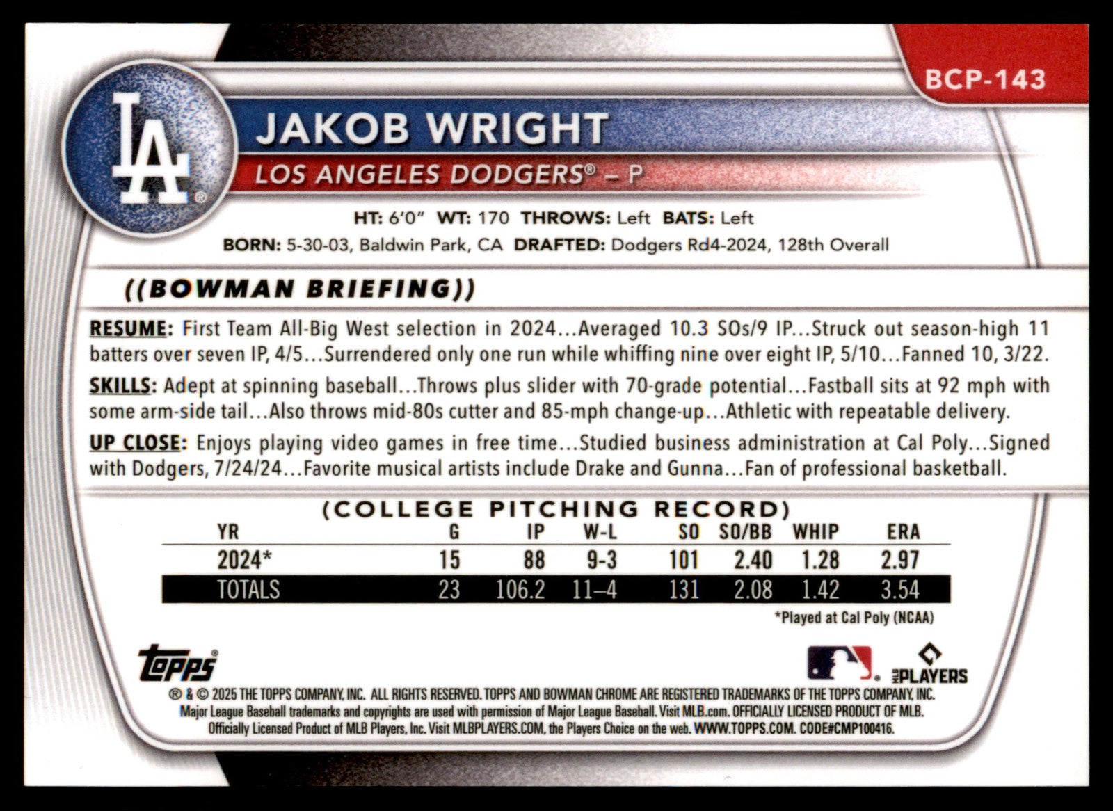 2025 Bowman Jakob Wright #BCP-143 Bowman Chrome Prospects Green Grass Refractor