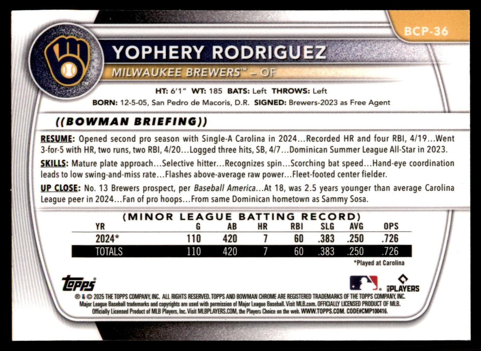 2025 Bowman Yophery Rodriguez #BCP-36 Bowman Chrome Prospects Reptilian Refracto