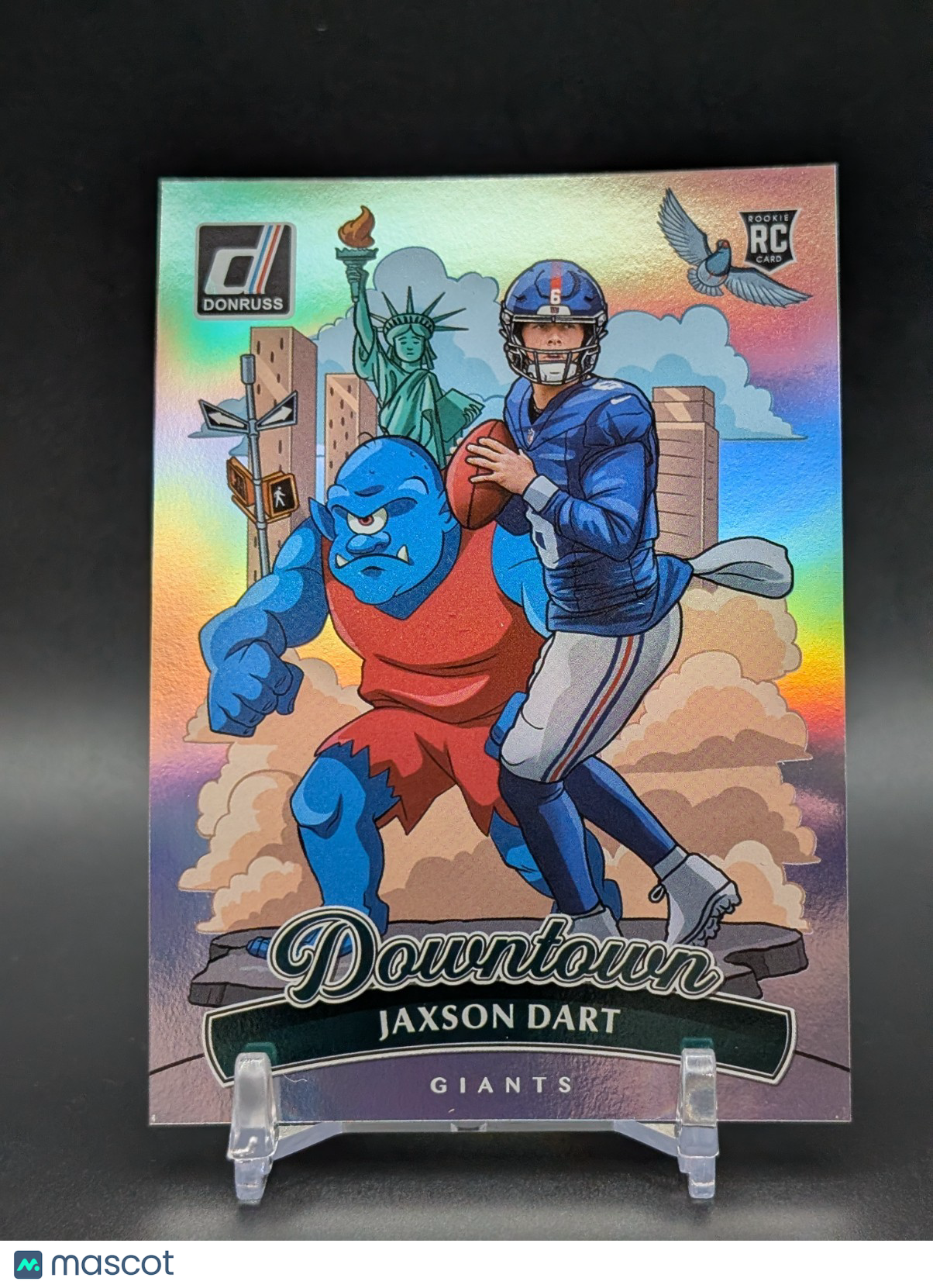 The 2025 Panini Donruss Downtown Jaxson Dart Rookie RC #14 Giants SSP Case Hit trading card is a highly sought-after collectible for football fans and card enthusiasts. This original card features Jaxson Dart, a promising rookie player from the New York Giants, making it a valuable addition to any collection. With its unique Downtown design and limited SSP variation, this card is a standout piece for fans of the National Football League looking for something special from their favorite manufacturer, Panini. Listed With Mascot.
