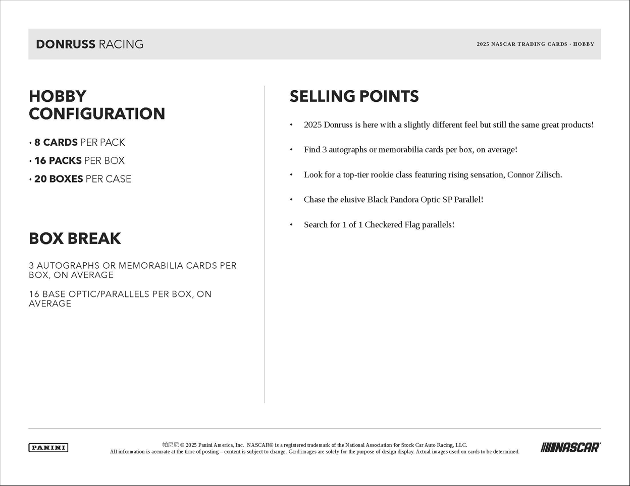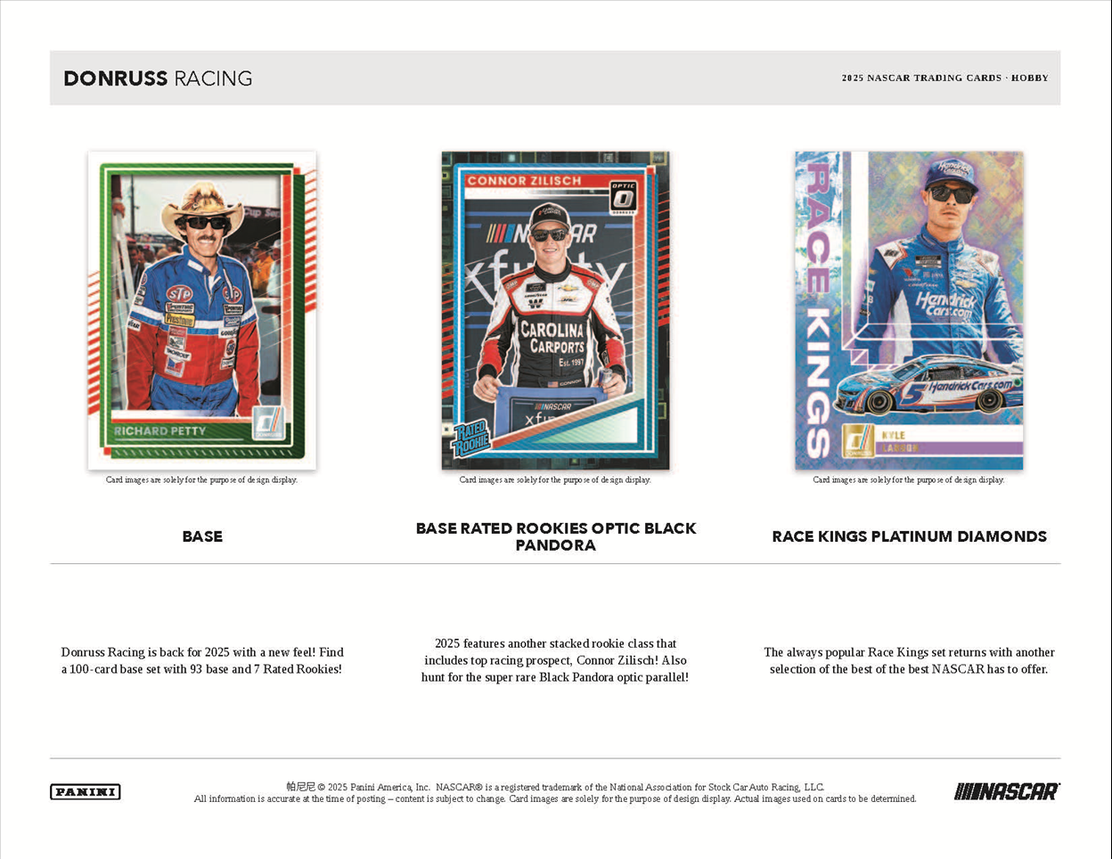 The iconic Donruss Racing brand returns for 2025 with a refreshed look and the same adrenaline-pumping content collectors crave! From legendary drivers to the hottest rookies like Connor Zilisch, this year’s release is loaded with racing thrills, exclusive parallels, and premium autograph and memorabilia hits.