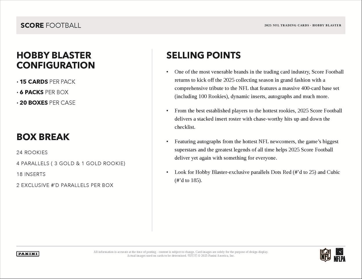 Get ready for one of the most anticipated football releases of the year! The 2025 Panini Score Football Hobby Blaster Box brings collectors a premium experience packed with star-studded content, exclusive parallels, and a huge 400-card base set featuring 100 of the hottest rookies in the game.