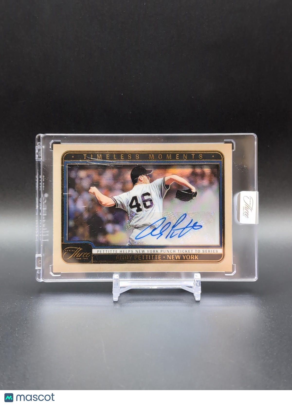 The 2025 Panini Three And Two Andy Pettitte Timeless Moments trading card is a highly sought-after collectible featuring an autograph from the legendary baseball player himself. This limited edition card, numbered out of 49, showcases Pettitte's connection to the New York Yankees and is officially licensed by Major League Baseball. Manufactured by Panini, this card is a valuable addition to any baseball card collection, encapsulated in a sturdy card stock material for preservation. With its authentic autograph and timeless design, this card is a must-have for fans of both the player and the sport. Listed With Mascot.